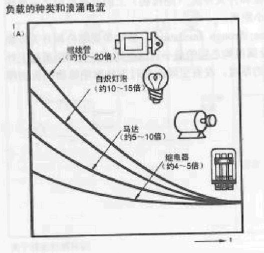 沖擊電流的產生和負載的種類和特性有關,和通斷頻率也有關系。特別是在有沖擊電流存在的負載的情況請與穩態電流一起測定沖擊電流值。下圖顯示了有代表性的負載種類與沖擊電流的關系。