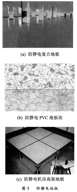 (4)防靜電地板:防靜電地板也有多種,按時效性分,有永久性和臨時性;按材料分有導電橡膠、PVC、導電陶瓷等;按鋪設方式分,有地面直接鋪設的和架空的活動地板??筛鶕嶋H需要和成本決定。如需要在地面走多種電纜、管道的環境如計算機房選擇架空鋪設的活動地板比較好。圖5是一些防靜電地板。