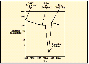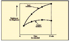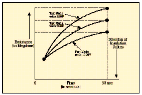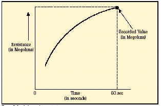 [page]在短時測試中,兆歐表被直接跨接在被測設備上,施加大約60秒的測試電壓。為了在大約一分鐘的時間內使絕緣值讀數達到穩定,應該只對低容性的設備進行該項測試。基本的連接步驟和驗證測試時相同,所施加的電壓按DC測試電壓公式進行計算。當測試好的設備時,您會注意到,隨電容容量和吸收電流的降低,絕緣阻抗值會穩定上升。由于溫度和濕度會影響測試結果,應該在標準溫度(大約20?C/68?F)下、露點之上的環境下進行測試。 當設備的額定值等于或小于1000伏特時,絕緣讀數應該為1MΩ或更高。當設備額定值高于1000伏特時,理想的阻抗應該為每1000伏特上升1MΩ。所測量的絕緣阻抗值通常會略低于以前記錄的值,其下降的趨勢規律如圖6所示。絕緣值下降的斜率是絕緣材料老化程度的正常信號。陡峭的下降斜率是絕緣失效或可能出現故障的先兆。