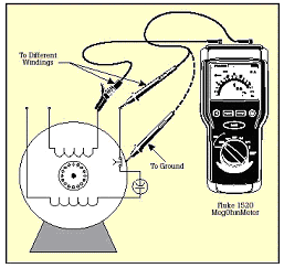當測試定子馬口鐵的阻抗時,要確保定子繞組和定子相是斷開的。測量繞組之間以及繞組和地之間的絕緣電阻。還有,當測量DC發電機或馬達時,應該將電刷提高,這樣,就能將馬口鐵和電樞分開來測量。下表列出了推薦的在不同的馬達額定電壓下的最小阻抗讀數
