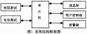 本文設計的電阻電容測試儀的系統結構框架如圖1所示,系統主要由用戶控制端、單片機、液晶屏、電阻測試模塊、電容測試模塊、報警器以及其它附加功能模塊等組成。當用戶需要測量某一電阻或電容的值時,只需要把此電阻或電容放在相應的測試位置,選擇好量程,測試儀即可自動測出其電阻值或電容值,并把測試結果顯示在液晶屏上,方便用戶讀取。另外,此測試儀還具有超出量程警示功能和記憶功能,可存儲最近十次的測量結果。