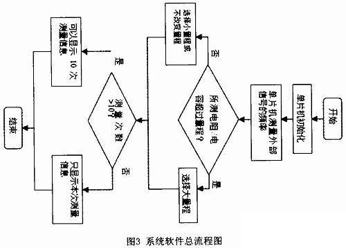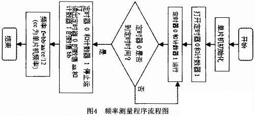 主要的子程序包括頻率測量子程序、鍵盤掃描子程序和數據存取子程序。頻率測量程序是系統軟件的核心,原理是用一個標準的頻率時鐘去計算被測的頻率,頻率測量程序流程圖如圖4所示。