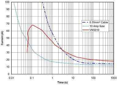 在圖3的示例中有一個點,智能開關(guān) (VN5010)將繼續(xù)前行,而電線將開始自毀(紅線在藍色虛線上方)。如果這種情況是真實的,甚至連電路板都可能會自毀。現(xiàn)在考慮到涌流要求很可能更加嚴格,我們開始意識到有必要開發(fā)一個能夠仿真熔斷器特性的保護算法。