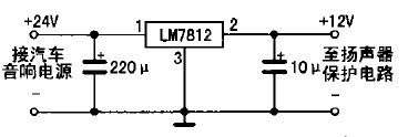 具體制作如下:先把功放輸出端與音箱的引線切斷,按圖2所示電路將引線頭a、b分別接功放的兩組輸出端,c、d分別接左、右聲道音箱:揚聲器保護電路的電源只能從收放機中獲取,不可直接從汽車12 v電源中獲取,否則不起開/關機保護作用;若是柴油車所配置的收放機(使用24 V電源),則要求增加一個降壓電路(見圖3所示),給揚聲器保護電路供電,以免電源電壓過高損壞IC。
