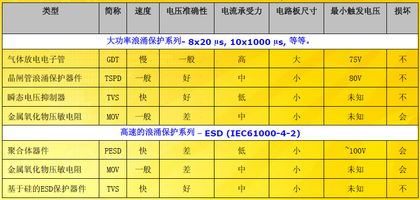 市場上有一系列對電子系統起保護作用的產品。下表簡單描述了各種產品的特征。