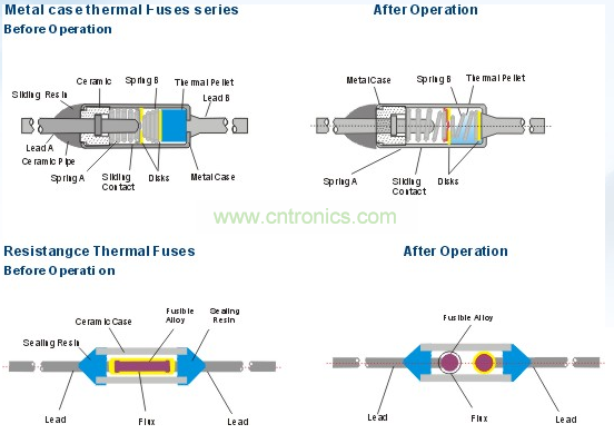 當溫度保險絲周圍溫度上升到它的動作溫度時,其易熔合金熔化并在表面張力作用下及特殊樹脂幫助作用下,收縮成球狀附兩引腳未端或保險絲內彈簧的彈力推走電極作用,這樣電路被切斷
