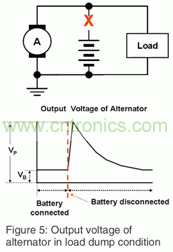 當引擎開始工作,電池從電源線上斷開,發電機繼續為汽車的電源線輸出電流,這是產生浪涌電壓的最糟糕的情況。這種情況就是所說的“甩負荷”,大多數汽車制造商和行業協會都會針對這種甩負荷狀態,制定最高電壓、線路阻抗,和這種甩負荷狀態的持續時間,如圖5所示。甩負荷的源阻抗高于正常條件下瞬態測試時的阻抗,因為電池已經斷開,只有發電機在向外輸出電能,這時發電機的內部線圈的作用就象一個限流電阻。