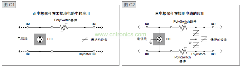 失效保護機構(gòu)是安裝在位于氣體放電管中心電極焊塊上的短路簧片。如圖G12所示,在正常的工作條件下,焊塊使得彈簧片浮在外側(cè)電極之上。當長時間放電使氣體放電管溫度達到焊塊的熔點時,焊塊就會被軟化,促使短路彈片被激活,并與兩個外側(cè)電極搭接。這個過程導致三個電極之間永久短路,建立起一條低阻抗路徑,將故障電流引到地面,而不會產(chǎn)生顯著的熱量。