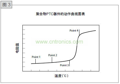 在圖3的Point 1時溫度較低,產生的熱量和散發的熱量達到平衡,但是當流過的電流較多或是環境溫度較高時,會產生較高的熱量,而提高PolySwitch器件的溫度,然而當電流或環境溫度的增加并不顯著,PolySwitch器件所產生的熱量可以散發至環境中而