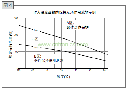 圖4說明了作為溫度函數的PolySwitch器件的保持和動作電流行為??梢詾槊總€可用器件定義一條這樣的曲線。A區說明了PolySwitch器件將動作 (轉到高電阻狀態) 以保護電路時的電流和溫度的組合。B區說明了PolySwitch器件將允許電路正常操作的