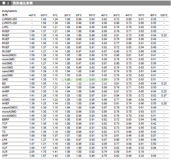 使用折減比率[環境溫度(℃)的保持電流(A)]表并選擇與電路最大環境溫度最匹配的溫度。瀏覽該欄以查閱等于或大于電路標準操作電流的值?,F在查看該行的最左邊,查閱最適于該電路的器件系列。