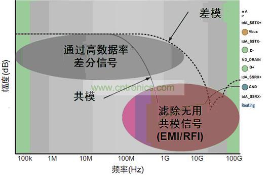 這些應用中能使用共模濾波器(CMF)來消除不想要的共模噪聲,并防止高速信號輻射有害的共模噪聲信號至系統其它元件。同時,CMF還使想要的高速數據事實上不受影響地通過。典型的CMF特性如圖4所示,圖中顯示消除了共模噪聲,同時支持差模信號無損通過。