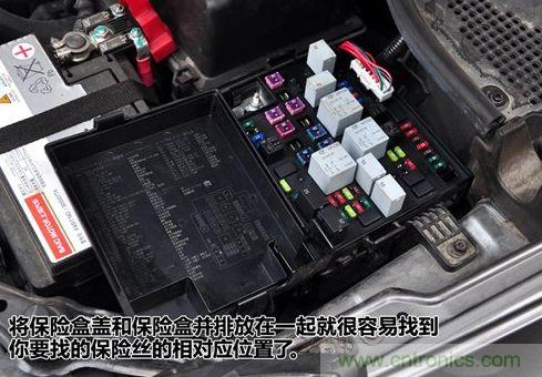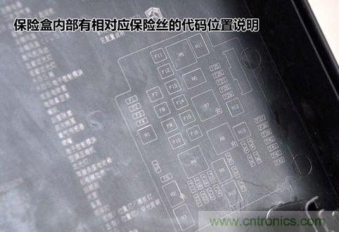 按保險盒蓋子內的保險絲對照表我們可以查找到我們要找的保險絲位置。