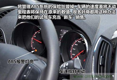 當您新購買車的時候發現車輛的里程表和車速表不工作時要注意了,因為很可能是奸商把您車輛管理ABS泵的保險絲給拆下來了,這樣車輛還能正常開但里程數不增加,而這也是很多奸商翻新試駕車后當新車賣的常用手段。