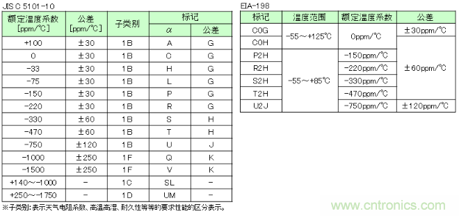表1:溫度補償用獨石陶瓷電容器的溫度系數值和公差以及其標記