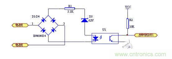 當(dāng)沒有振鈴信號(hào)時(shí),線路上的供電電壓為48V(部分交換機(jī)為60V),經(jīng)四個(gè)二極管構(gòu)成的全橋整流后,不足以使62V穩(wěn)壓管導(dǎo)通,振鈴信號(hào)輸出端電壓接近0V,當(dāng)振鈴信號(hào)到來時(shí),線路上的90V交流振鈴信號(hào)經(jīng)全橋整流變換后90V的脈動(dòng)直流電,其峰值足以擊穿耐壓值為62V穩(wěn)壓管,經(jīng)電阻R1給U1提供電壓,從光電耦合器輸出的波形是 時(shí)通時(shí)斷的方波方波信號(hào),可以直接輸出至單片機(jī)的中斷輸入口, CPU可以根據(jù)振鈴信號(hào)光電轉(zhuǎn)換后的高低電平檢測(cè)有無振鈴。