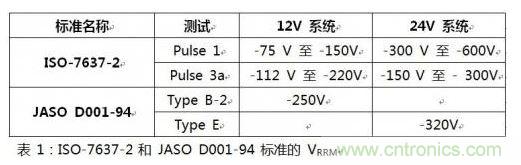 最大重復(fù)反向電壓是二極管在反向偏壓模式中能夠承受的最大電壓。在反向偏壓模式中,流過(guò)二極管的漏電流會(huì)在二極管結(jié)中產(chǎn)生熱量并導(dǎo)致熱失控。模擬該條件的測(cè)試包括美國(guó)的ISO-7637-2 pulse 1和3a以及日本的JASO D001-94標(biāo)準(zhǔn)type B和E.Each,這些測(cè)試的峰電壓如下表所示。