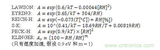 檢索現有文獻,Peck是提到的另一個作者。他改變了Lawson建議值,發現使用相對濕度能夠適應他自己的測試結果。在一篇文章里,Hallberg很好地概括了所有濕度測試和加速模型,包括他自己的。過去30年,他與Peck對濕度加速進行了大量研究。在很多出版物里都提到,他們的研究成果的適應性最好。圖8是Hallberg收集的可用模型。除了溫度意外,他們都使用相對濕度做為主要的測量參數。檢索最近幾年有關濕度加速的出版物,我們發現,人們還在使用與Hallberg和Peck 描述或收集的模型相同的或可比較的模型。