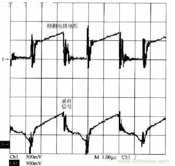 圖4給出了UC3842檢測電阻的電壓波形和采樣信號波形。從圖4中可以看出,經過改進后的電路,其采樣信號的波形緊緊跟隨檢測電阻的電壓波形,沒有出現非常大的尖峰電壓。因此,該電路能有效避免因變壓器漏感等異常干擾引起的電源誤操作的問題,也能有效避免因電源占空比過大而引起的系統不穩定的問題。