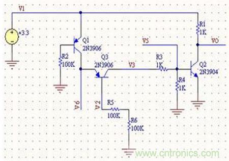 若Q1和Q3基極同時為低時,Q2導通而使得VO為0造成晶振停振關閉處理器。我們分析R3和R4(實際電路470K)使得Q2和Q3處于飽和態;Q3為Q1集電極負載,調整R5阻值時可控制Q1處于飽和態或放大態。要使Q2基極導通必須使Q1提供足夠大電流才滿足條件,只有Q1處于放大態才滿足條件;