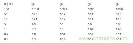 比較分四組進行:①用普通數字萬用表測量;②用四線測量(借助于數字萬用表本身的恒流源電流);③用四線測量(用外加的恒流源電流);④饋線補償測量。