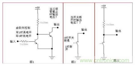 我們將圖1簡化成圖2的樣子。圖2中的開關(guān)受軟件控制,“1”時(shí)斷開,“0”時(shí)閉合。很明顯可以看出,當(dāng)開關(guān)閉合時(shí),輸出直接接地,所以輸出電平為0。而當(dāng)開關(guān)斷開時(shí),則輸出端懸空了,即高阻態(tài)。這時(shí)電平狀態(tài)未知,如果后面一個(gè)電阻負(fù)載(即使很輕的負(fù)載)到地,那么輸出端的電平就被這個(gè)負(fù)載拉到低電平了,所以這個(gè)電路是不能輸出高電平的。