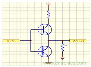 集電極開路輸出的結(jié)構(gòu)如圖1所示,右邊的那個(gè)三極管集電極什么都不接,所以叫做集電極開路(左邊的三極管為反相之用,使輸入為"0"時(shí),輸出也為"0")。對于圖1,當(dāng)左端的輸入為“0”時(shí),前面的三極管截止(即集電極C跟發(fā)射極E之間相當(dāng)于斷開),所以5V電源通過1K電阻加到右邊的三極管上,右邊的三極管導(dǎo)通(即相當(dāng)于一個(gè)