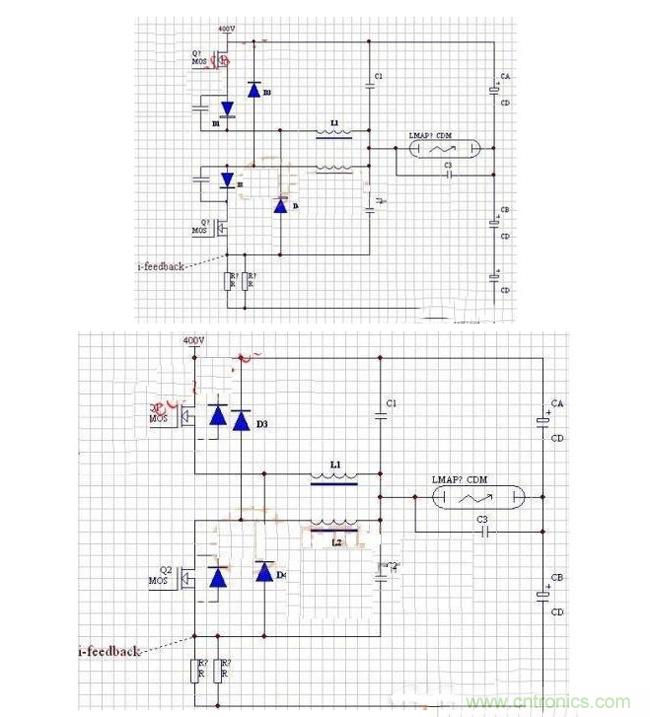 三級的效率其實不是問題。調試得當 91是沒太大問題的。可問題不在效率這里。換向鋁電解的問題,的確是個問題,不然CCI也不會出如此復雜的波形來控制。但這個問題,根本上來說,是可解決的,只是控制電路復雜一些而已。三級電路如果降壓為母線端,則需要高壓驅動,驅動麻煩。當然這樣的結果是取樣方便。如果在地端,則取樣不便。全橋不可控狀態。