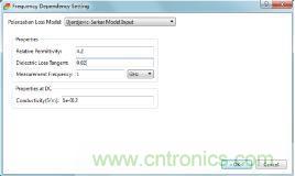 模型生成好后,電容出線的兩端會自動生成Wave Port,所以不需要你手動去設置Port,這里還有一點就是材料的參數以及孔徑需要你去設置,材料參數設置因為是前仿真,所以用Djordjevic-Sarkar Model Input簡單的頻變模型(圖7),只需要設置一個頻點的Dk和Df值就可以求解寬帶的頻變曲線。具體設置界面如下所示,這里我們板材選用FR-4,Dk和Df的值選擇1GHz頻點。