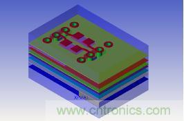這里我們以0402的AC耦合電容為例進行仿真,一端Botm層通過換層過孔連接Top面的AC耦合電容,另外一端通過過孔再連接到Art12層,這里我們分別仿真3種情況;電容掏空到GND02層,X方向掏34mil,Y方向掏66mil(Case1)。模型建好后的3D效果圖如圖4所示。