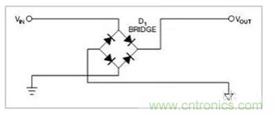 2.另外還可以用二極管橋對輸入做整流,這樣電路就永遠有正確的極性(圖2)。這些方案的缺點是,二極管上的壓降會消耗能量。輸入電流為2A時,圖1中的電路功耗為1.4W,圖2中電路的功耗為2.8W。