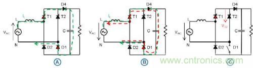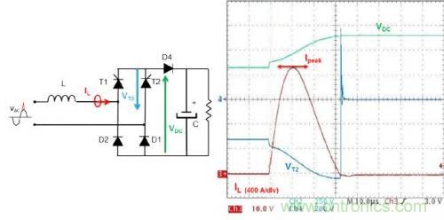 在 90°相角時,T1和D1導通。浪涌提高電流,并致使D4導通,因為PFC電感保持電壓。浪涌電流旁通二極管D4,避免燒毀PFC續流二極管(D3)。