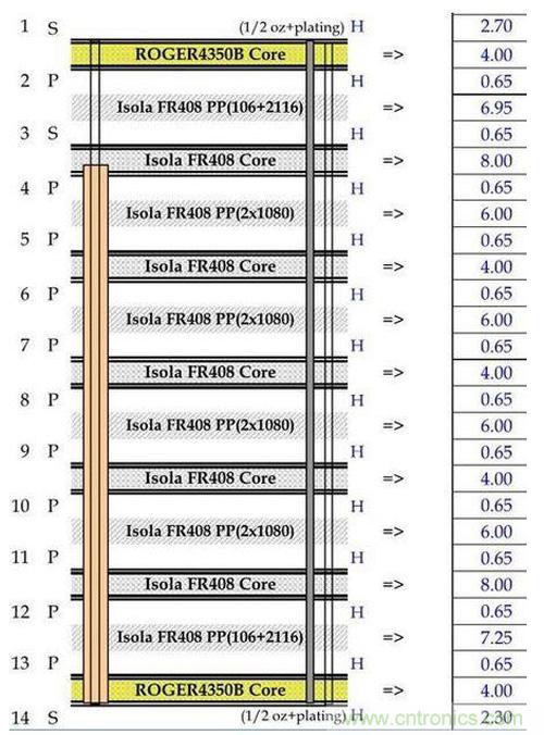 圖1:多層電路板的疊層圖,圖中展示了FR4材料和Rogers 4350以及核心層厚度。