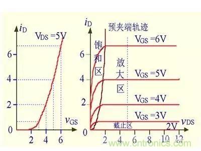 在轉移特性曲線上,gm 是曲線在某點上的斜率,也可由iD的表達式求導得出,單位為 S 或 mS。