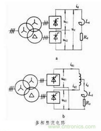 隨著整流電路的功率進一步增大(如軋鋼電動機,功率達數(shù)兆瓦),為了減輕對電網(wǎng)的干擾,特別是減輕整流電路高次諧波對電網(wǎng)的影響,可采用十二相、十八相、二十四相,乃至三十六相的多相整流電路。圖3a為兩組三相橋串聯(lián)組成的十二相整流電路。為了獲得十二相波形,每個波頭應該錯開30°。所以采用三繞組變壓器,次級的兩個繞組一個接成星形,另一個接成三角形,分別供給兩組三相橋。兩組整流橋串聯(lián)后再接到負載。由于兩組整流橋輸出的電壓的相位彼此差30°,因此在負載上得到十二脈波的整流電壓,合成電壓中最低次諧波頻率為600Hz,輸出電壓ud=ud1+ud2,電流id=id1=id2。圖3b是兩組三相橋并聯(lián)組成大電流的十二相整流電路。兩橋變壓器次級繞組電壓依次相差30°。若兩組橋的交流線電壓相等,各自的控制角也相等,則兩組橋的整流平均電壓也相等,只要極性相符合,就可以并聯(lián)運行。但是兩組整流電壓的瞬時值是不等的,兩組電源間會出現(xiàn)交流環(huán)流。為了限止環(huán)流,延長晶閘管的導通時間,需要加入平衡電抗器,輸出電壓ud=(ud1+ud2)/2,電流id=id1+id2。