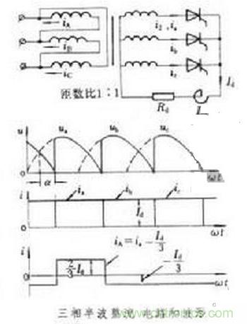由圖可見,變壓器次級繞組電流i2可以分解成直流分量i2=和交流分量i。由于直流分量i2≈只能產(chǎn)生直流磁通勢,所以它無法影響初級電流作相應變化。而交流分量 i將通過變壓器的磁耦合反映到初級電流中去。這樣,初、次級電流有效值分別為I1=Id/3、I2=Id/。在α=0°和不考慮電網(wǎng)電壓波動等情況下,得S2=1.48Pd、S1=1.21Pd、S=1.345Pd, 其中Pd為整流功率。在三相橋式電路中,次級無直流分量電流,所以初、次級電流是波形相同的交流電,故S=1.05Pd,可見橋式接線時變壓器利用率提高。
