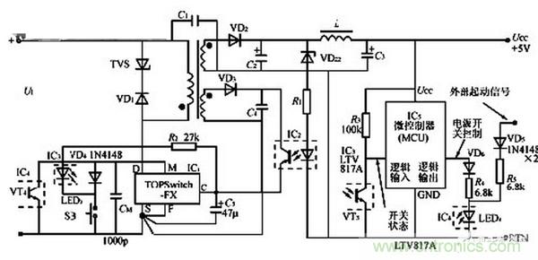 【導讀】開關電源部分主要由TOP Switch FX(IC1)、光耦合器(IC2)組成??刂齐娐穭t包括微控制器(MCU)、兩片LTV817A線性光耦合器(IC3、IC4)、按鈕開關SB。