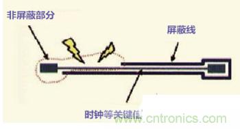 在高速的PCB設計中,時鐘等關鍵的高速信號線,走線需要進行屏蔽處理,如果沒有屏蔽或只屏蔽了部分,都會造成EMI的泄漏。建議屏蔽線,每1000mil,打孔接地。