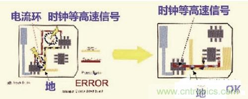 所有的高速信號必須有良好的回流路徑。盡可能地保證時鐘等高速信號的回流路徑最小。否則會極大的增加輻射,并且輻射的大小和信號路徑和回流路徑所包圍的面積成正比。