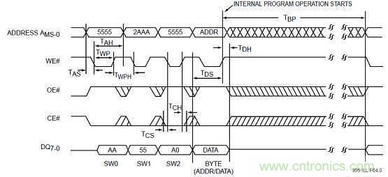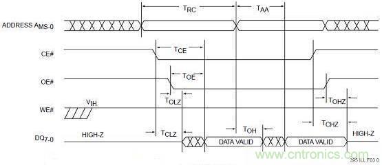 從圖中我們可以看出ADDRESS是表示地址總線的,DQ是表示數(shù)據(jù)總線的,CE是片選信號,且是低電平有效,其寬度要保證在進行讀操作時總是有效的。學(xué)會看時序圖對于做嵌入式系統(tǒng)開發(fā)非常有幫助,因為我們不可避免的要與芯片打交道。在時序圖中,通常會標(biāo)識很多的時間需求信息。在寫啟動代碼時需要初始化各地址空間的片選地址寄存器和讀寫時序,時序的配置依據(jù)就是來自于外設(shè)芯片的時間需求,這是芯片手冊很重要的一部分內(nèi)容。當(dāng)一個地址空間中存在多個外設(shè)芯片時,我們需要考慮到其中最慢的外設(shè)芯片的時間需求,否則的話有的芯片就不能正常工作。
