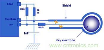 在STM8S的解決方案中,ST提供了感應電極和走線的設計規范和如圖3所示的Driven Shield功能(在Shield線上提供與按鍵管腳相同的驅動信號,電極與Shield之間的寄生電容就不會被充放電),能有效地減少感應電極走線的寄生電容對按鍵靈敏度的影響。