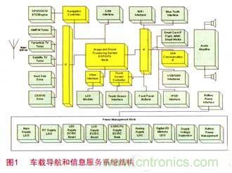 【導讀】在車載電子系統中,信息娛樂(Infotainment)系統是發展最為迅速的部分,它主要可分為三大類:音頻(CD)、視頻(DVD)以及導航和遠程信息服務。最新的進展已經可以將USB、MP3、藍牙、iPod和杜比帶入車內。圖1為新的車載導航娛樂和信息服務系統的結構圖。