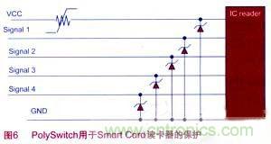 接觸式Smart Card內部有一個IC芯片,用于傳輸信息、存儲數據等。Smart Card工作時,由讀卡器的Vcc電壓供電。損壞的Smart Card或者其他導電物品被錯誤地放進讀卡器,都有可能造成讀卡器電路出現短路,而造成永久損壞。在讀卡器電路中使用PolySwitch可恢復器件能夠對此類電路故障進行保護。如圖6,在讀卡器的Vcc供電電路中串聯PolySwitch器件,當出現短路過電流故障時,PolySwitch器件能夠切斷電路,在故障排除后恢復電路,并在所有端口進行ESD防護。