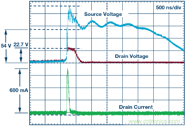 圖6. 8 kV事件期間的漏極電壓和漏極輸出電流。
