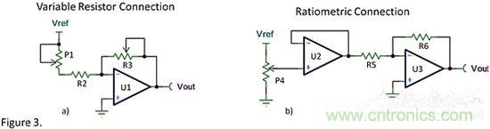 圖3b中引入了運(yùn)算放大器U2,使得電位器工作在比例模式,從而可以消除圖3a中的缺陷。運(yùn)算放大器U2提供了高的輸入阻抗從而減小了接觸電阻的影響。隨著電位器位置的變動(dòng),運(yùn)算放大器U2的輸出電壓從0V到Vref之間精確變化。給運(yùn)算放大器U3提供一個(gè)精確的電壓范圍,從而只需給R5、R6設(shè)定一個(gè)固定的阻值,而且不需要對(duì)電路進(jìn)行增益調(diào)節(jié)。
