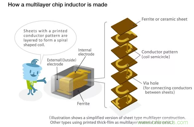多層片狀電感的制作工藝:將鐵氧體或陶瓷漿料干燥成型,交替印刷導(dǎo)電漿料,最后疊層、燒結(jié)成一體化結(jié)構(gòu)(Monolithic)。