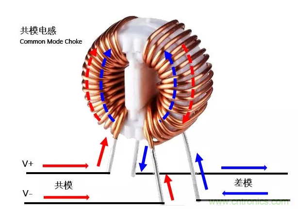 當(dāng)有差模成分流過共模電感時,根據(jù)右手定則,會在兩個線圈形成方向相反的磁場,相互抵消,相當(dāng)于對差模信號存在較低的感抗。