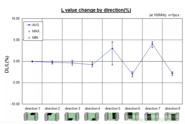 可以看出,標(biāo)記點(diǎn)朝側(cè)面,感值變化較大,所以貼片時應(yīng)注意讓電感上的標(biāo)記點(diǎn)朝上。