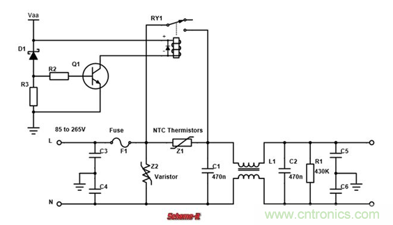 繼電器初始是斷開的。當Vaa逐漸達到自身電壓的時候,齊納二極管D1導通,三極管Q1打開,繼電器RY1閉合,相當于把限流NTC熱敏電阻Z1短路。