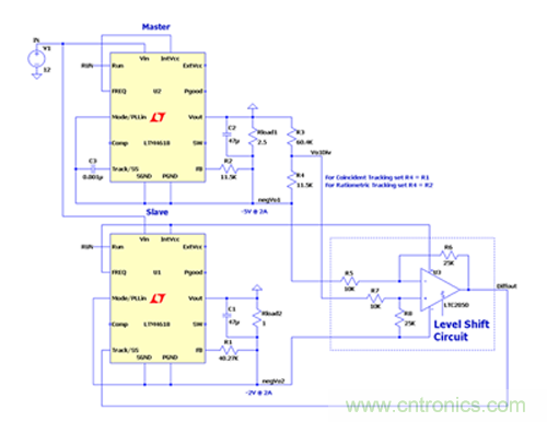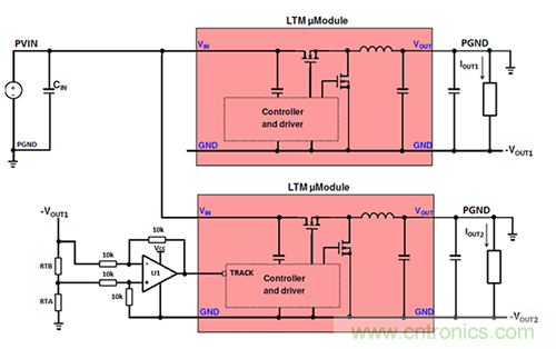 TRACK引腳輸入允許μModule穩壓器通過將跟蹤信號(即,主μModule穩壓器的輸出電壓軌的分壓版本)提供給從μModule穩壓器的TRACK引腳來跟蹤另一電源軌的輸出電壓斜坡。每個μModule穩壓器內部控制器所看到的TRACK引腳電壓與其μModuleGND引腳相關,但在需要配置兩個負輸出轉換器進行跟蹤的應用中,μModule穩壓器的GND引腳可以處于不同的電位。主和從GND引腳電位差異意味著主設備提供的跟蹤信號不能直接施加到從設備的跟蹤引腳。在這些類型的應用中,需要額外的考慮以確保從機相位能夠看到來自主機相位的正確參考的跟蹤信號。